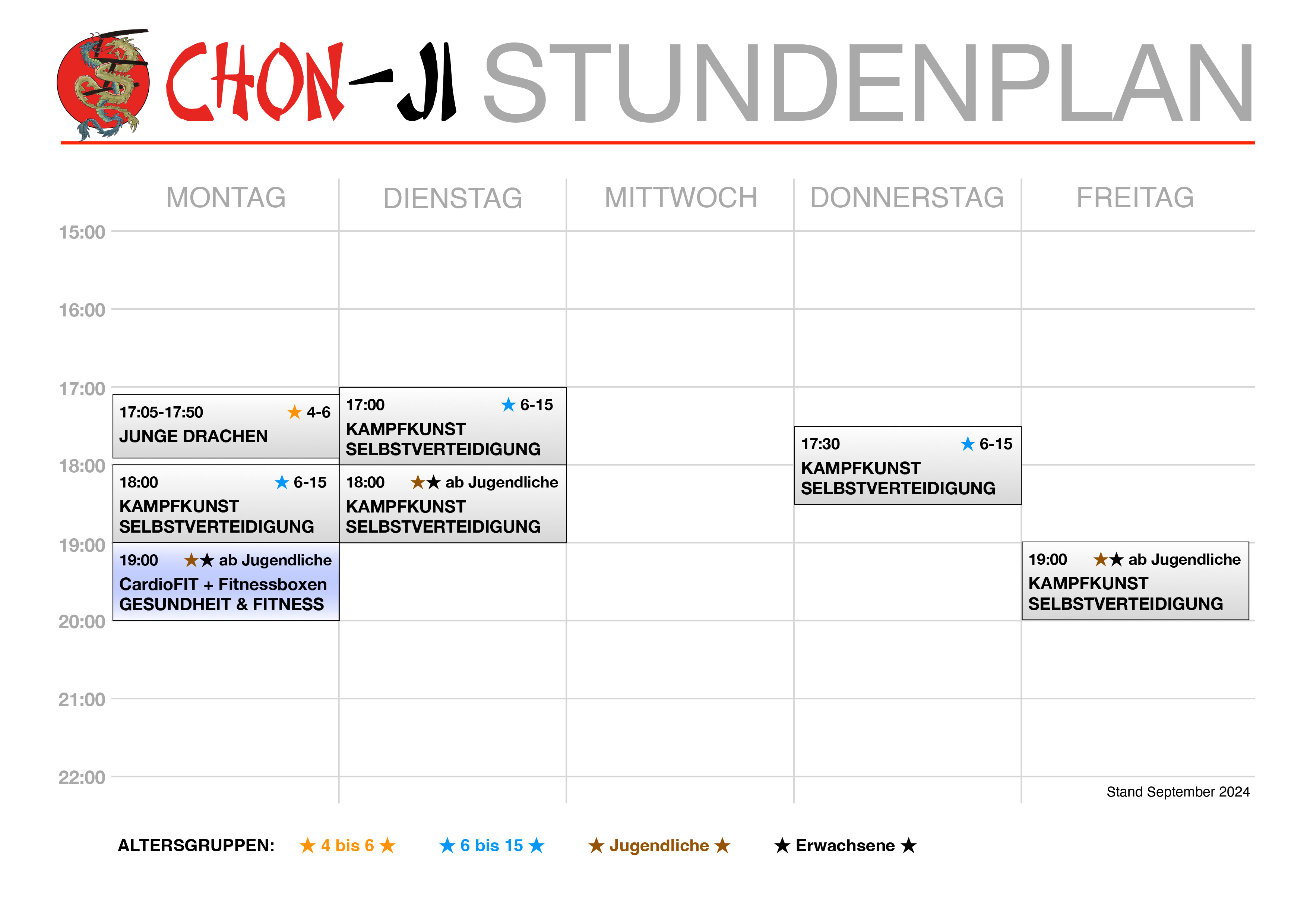 Der Stundenplan gibt ein grobe Orientierung.Die letztendliche Einteilung unserer Schülerinnen und Schüler erfolgt nach dem Probetraining, ggf. in Absprache zwischen verantwortlichen Trainern und Eltern.